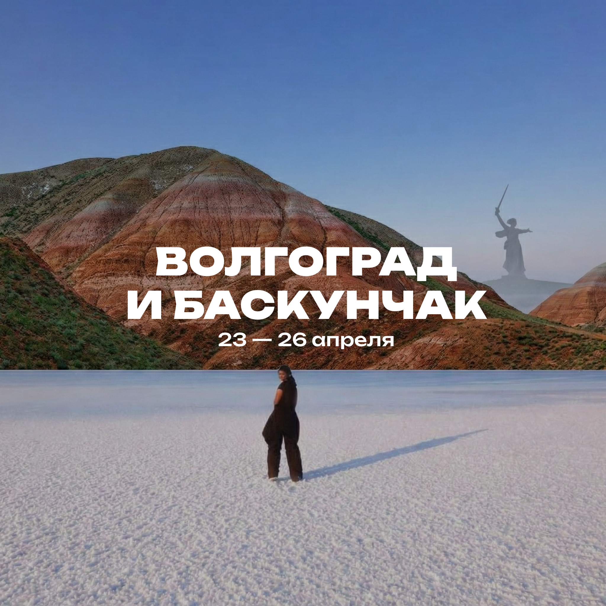 Иногда достаточно одной поездки, чтобы удивиться, насколько разной может быть Россия. В этом путешествии мы проведем день в потрясающем волжском городе Волгограде, где ветер гуляет по склонам Мамаева Кургана, а уже на следующий день пройдёмся по ослепительно белой соли озера Баскунчак, щурясь от солнца и не веря, что это не юг где-нибудь за границей. Ближе к вечеру поднимемся на алую гору Богдо, чтобы встретить закат над степью — в тишине, где слышен только ветер. И завершим день ужином с ароматными блюдами национальной кухни, когда разговоры становятся теплее, а впечатления — ярче. Это маршрут удивляет контрастами и оставляет чувство масштабного путешествия даже за такой короткий срок.