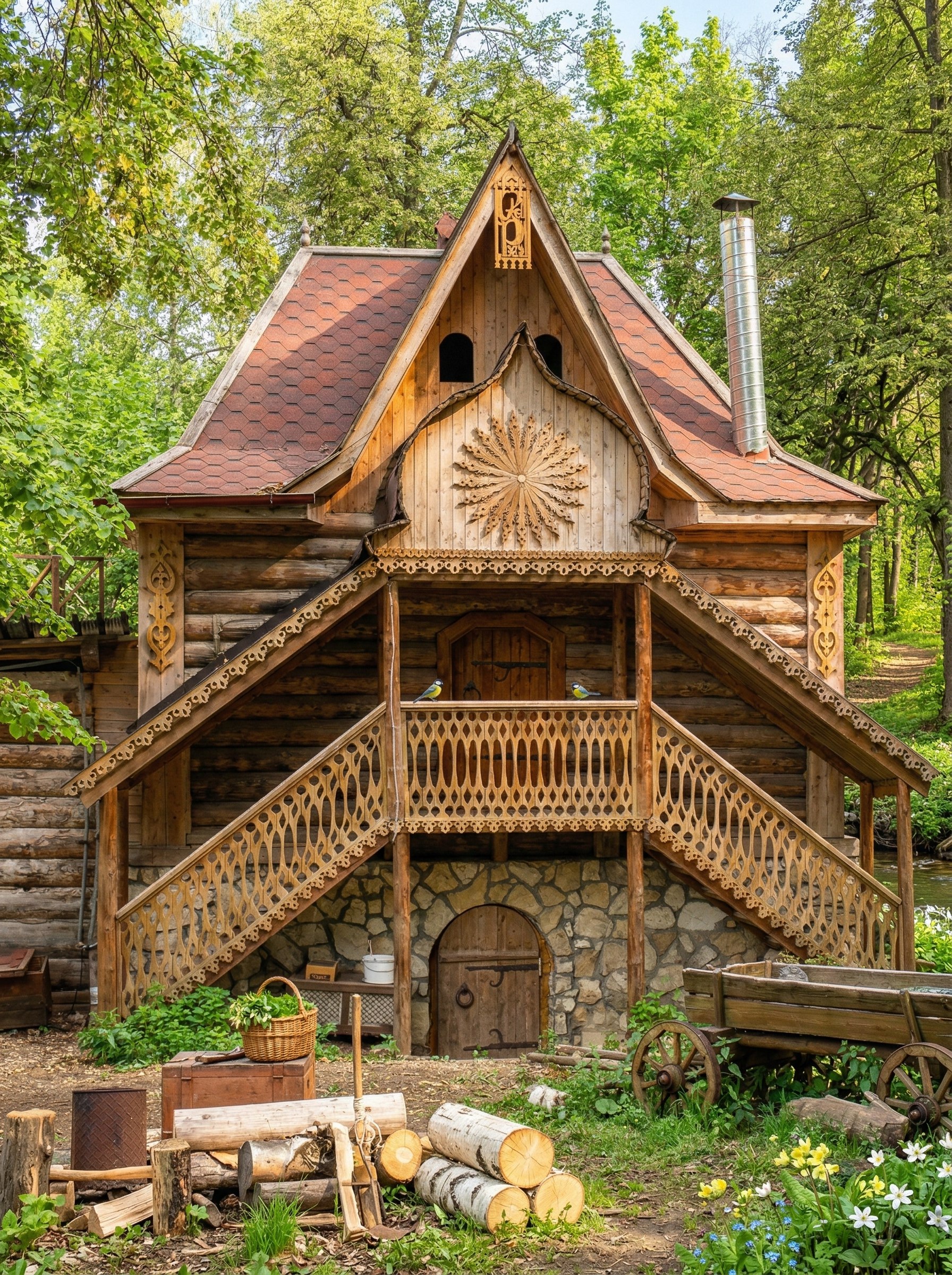 Там стоит настоящий деревянный терем — такой, в каких жили на Руси сотни лет назад. Вокруг — уютная территория, кузница, животные, телеги, всё по-настоящему. Приезжаешь и будто проваливаешься в другую эпоху: пахнет деревом, дымком, где-то рядом лошади фыркают, тишина и красота.